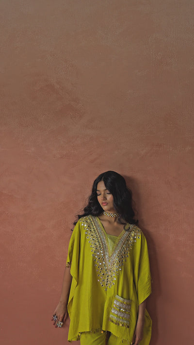 Elevate your everyday elegance with our Pear Green Embellished Kaftan Set, crafted from organic cotton for a breathable and conscious wear. This relaxed silhouette features a flowy kaftan top adorned with hand-embroidered mirror work, delicate Golden Lace and sequin embellishments, creating a dazzling yet earthy charm.
