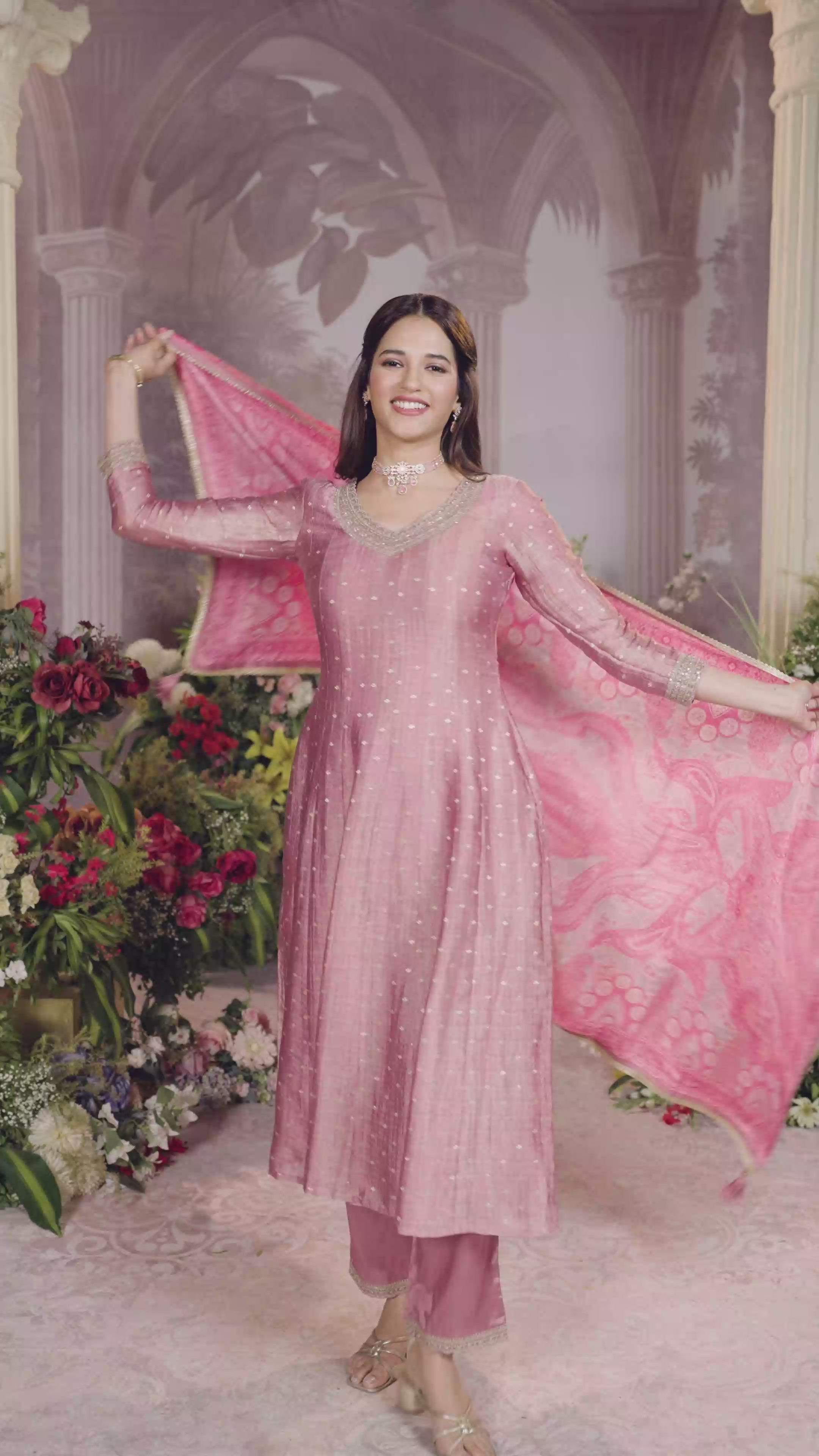 Step into elegance with this Light Blush Embellished Pants Set, featuring delicate sequin and cut dana handwork that adds just the right sparkle. Crafted in shimmering silk, the flare kurta pairs effortlessly with matching pants, while the soft pink dupatta completes the look with a touch of charm. Perfect for celebrations where you want to dazzle with playful grace.