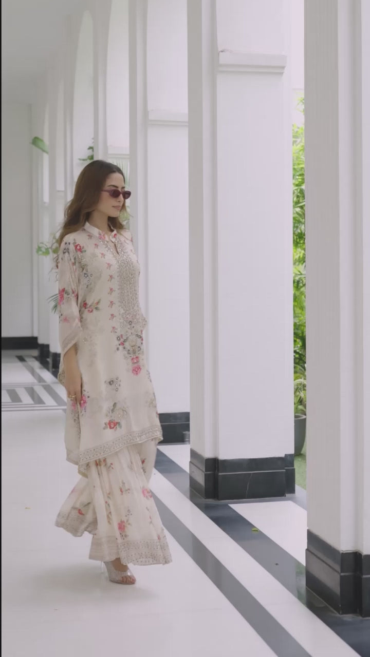 Elevate your festive look with this Light Champagne Kaftan Set, featuring a printed chinon silk kaftan paired with a stylish sharara and a chic crop top. Delicate stone work adds just the right sparkle, making it perfect for celebrations where you want to shine with effortless charm and playful elegance.