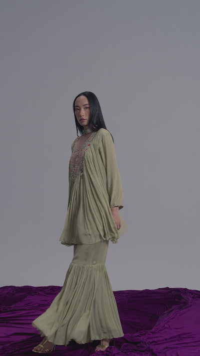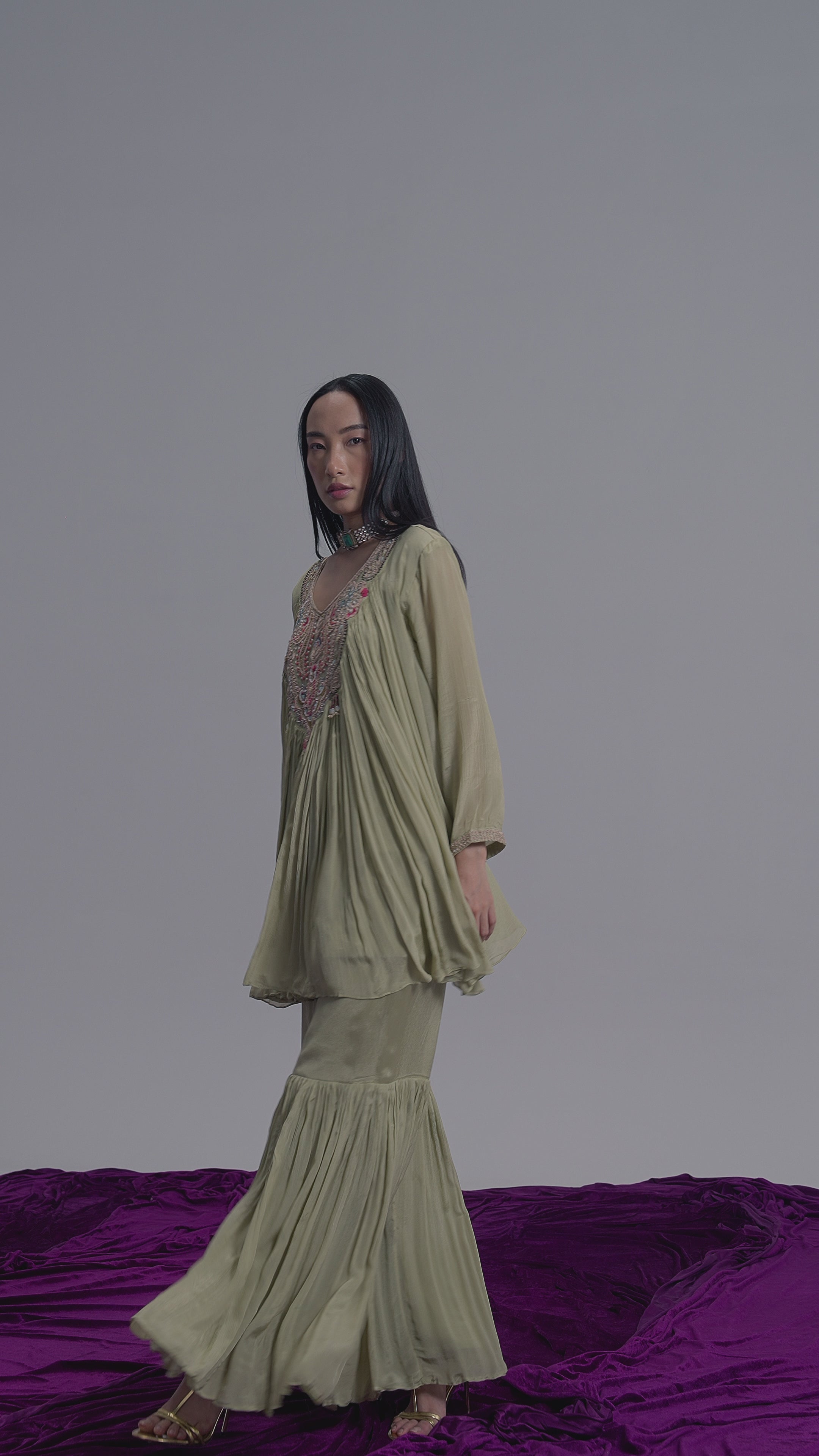 Grace your festive moments with timeless elegance in this Light Green Sharara Set, adorned with intricate hand embroidery and delicate embellishments. A true blend of tradition and luxury.