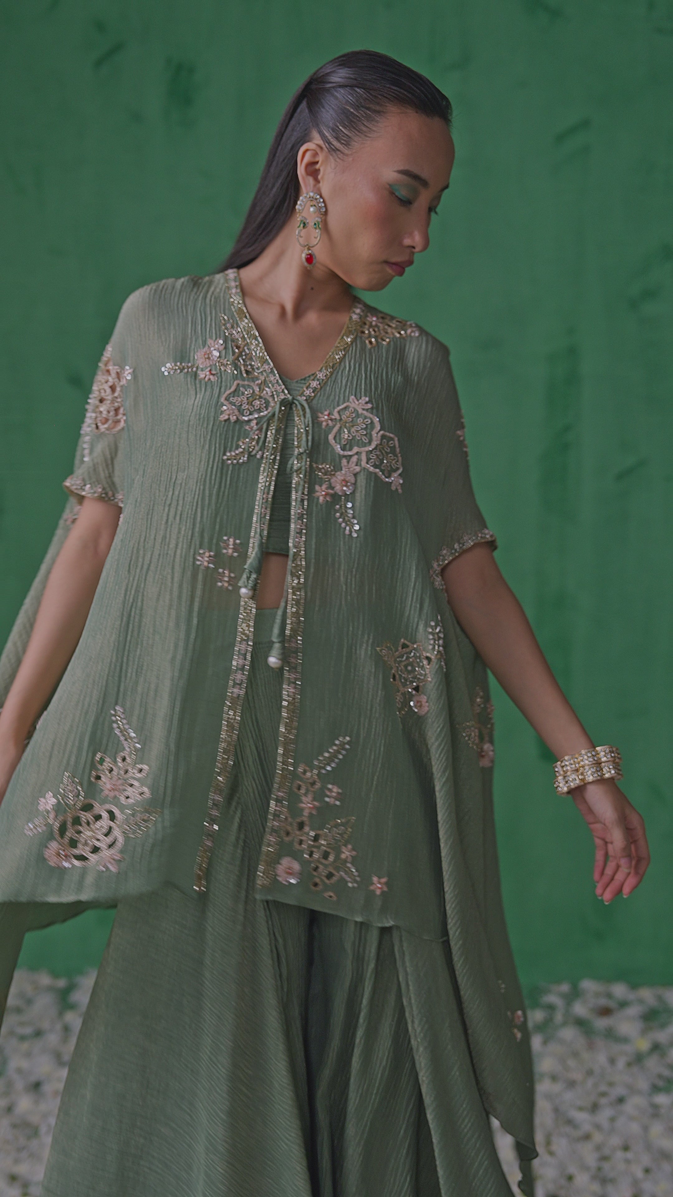 Light Green Embellished Padded Crop Top With Palazzo and Complimenting Shrug with Drawstrings
