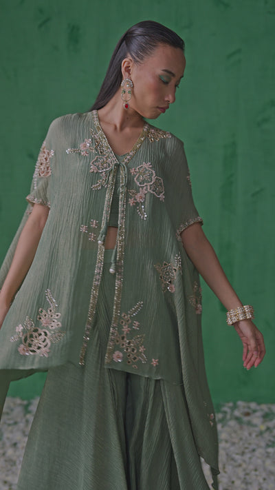Light Green Embellished Shimmer Organza Silk Cape Set