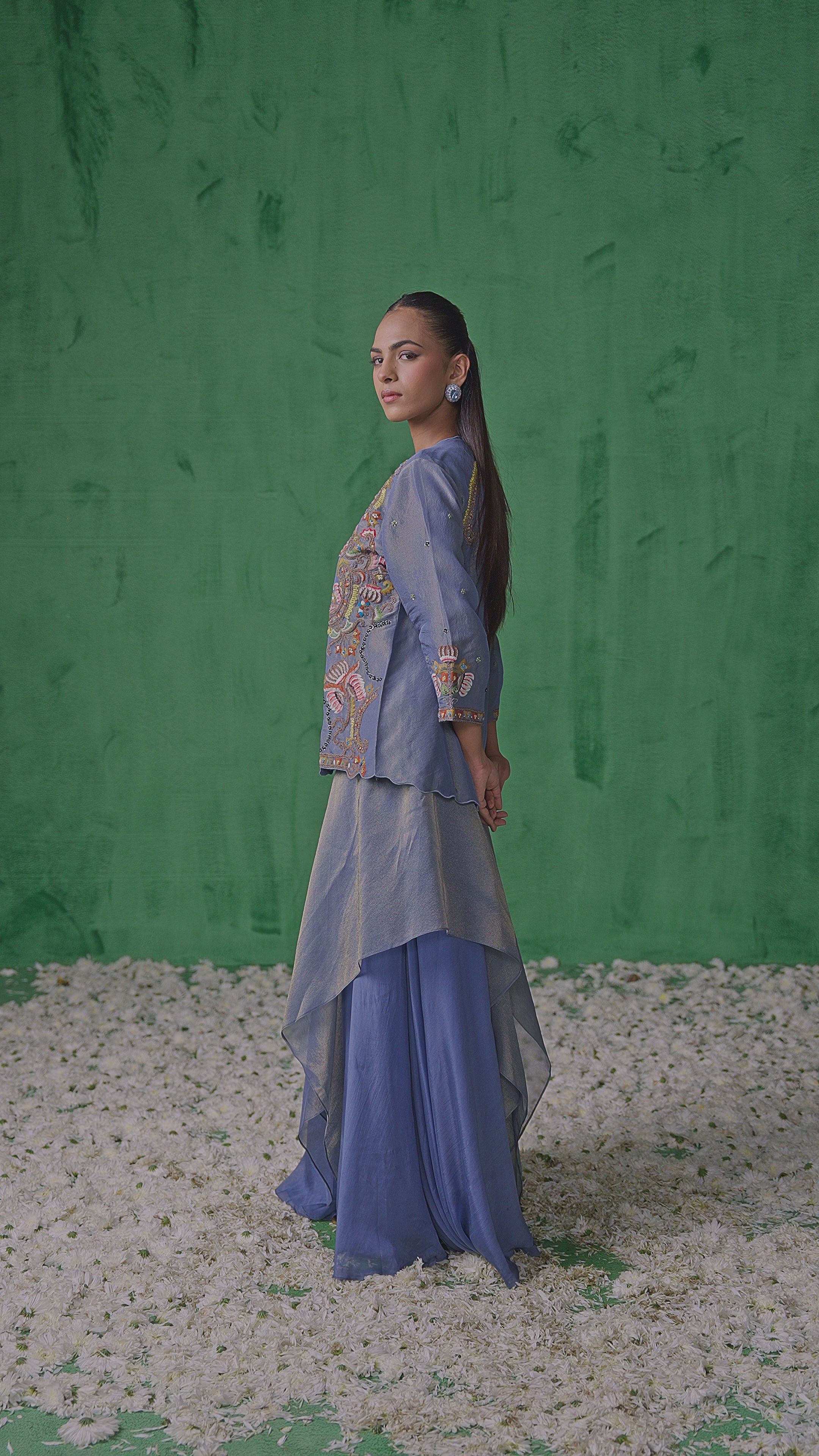 Powder Blue Embellished Jacket, A-Symmetric and pleated Tunic with complimenting wide-leg Palazzo.