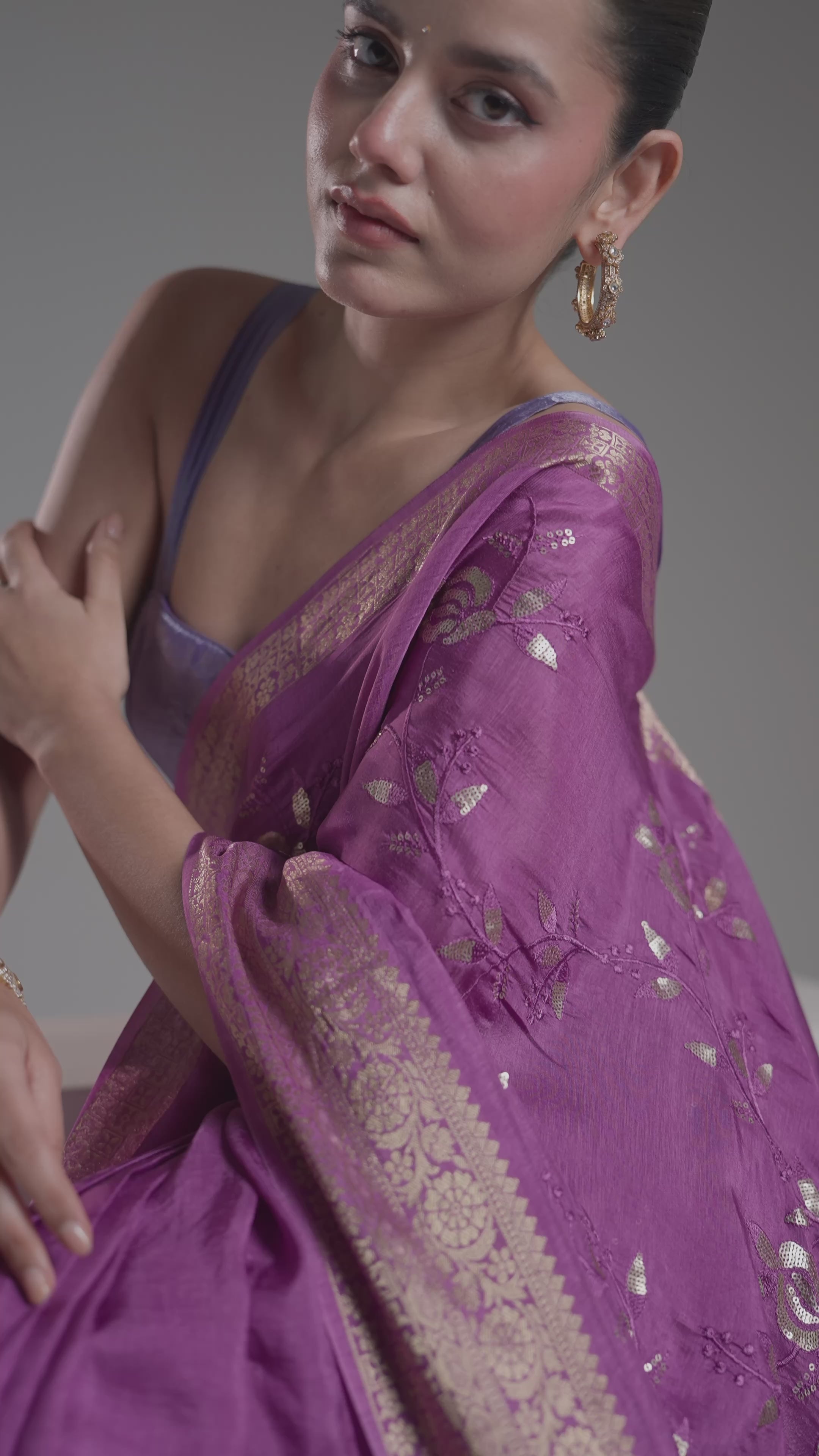 Add a dash of shimmer to your wardrobe with this lilac Russian silk saree, sparkling with sequins and intricate zari details. Its luxurious fabric flows smoothly, making every twirl a dazzling delight. Perfect for festive moments when you want to shine and feel fabulous. Comes with a matching unstitched blouse.