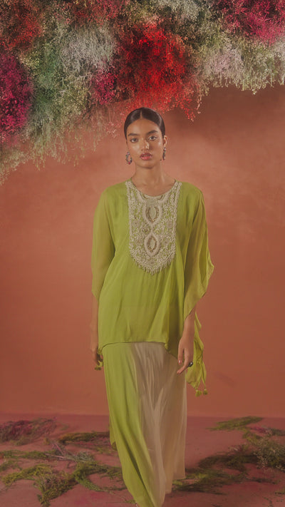 Elevate your festive look with this elegant georgette kaftan set, featuring a heavily embellished neckline adorned with beads, thread work, and sequins. Delicate thread tassels line the hem for added charm, while the outfit comes with an attached inner and a beautifully flowing ombre drape skirt for a refined, layered silhouette. Perfect for Mehndi, Haldi, Diwali, Eid, or intimate wedding celebrations, this elegant kaftan set blends comfort with festive charm.