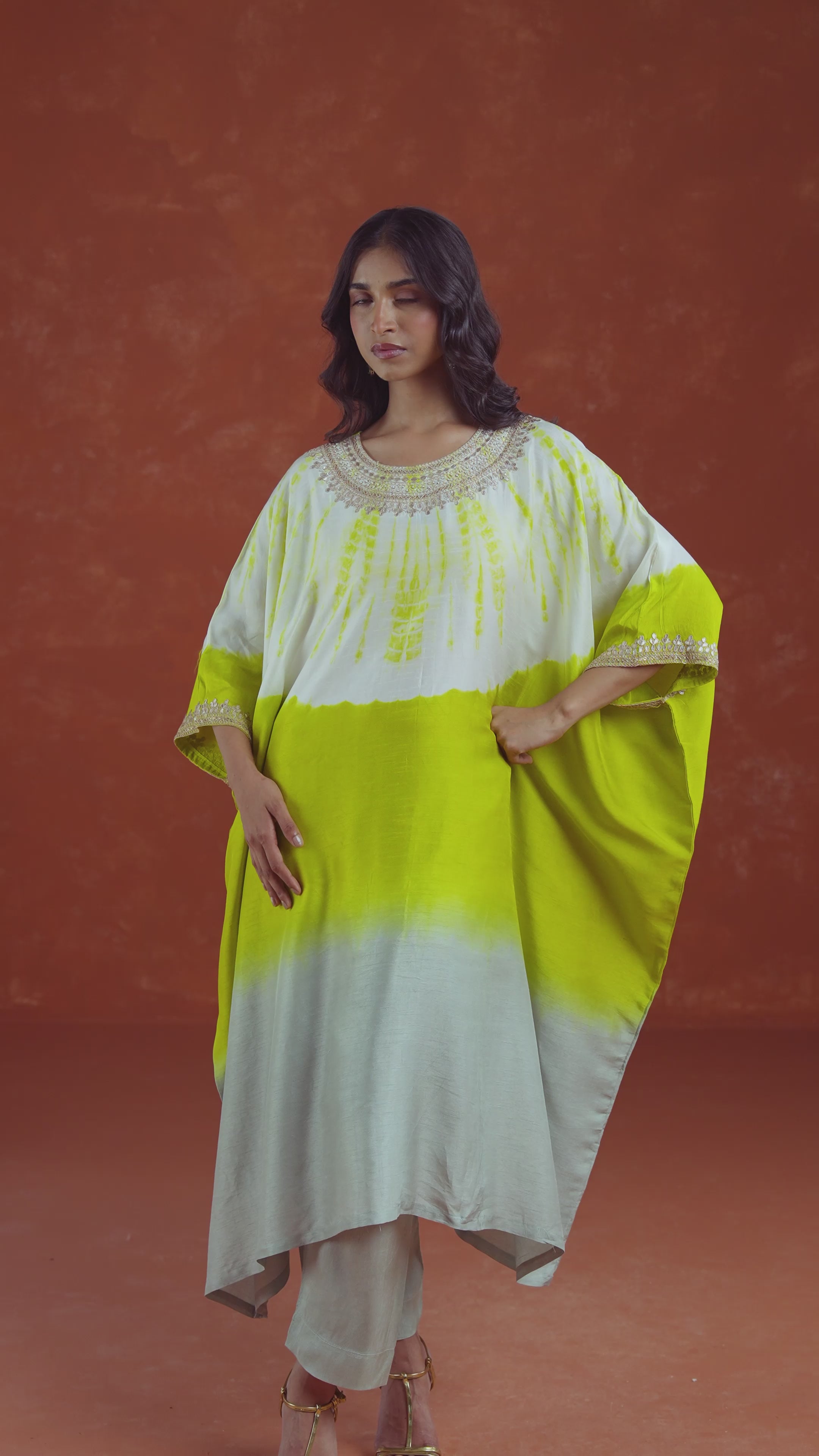 Color: Lime Green Kaftan with Shibori Tie-Dye; Grey Pant