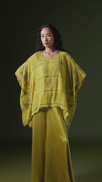 Radiate confidence in this bold and beautiful Lime Green Ensemble. This three-piece set features a flowing georgette silk kaftan with a tie-dye print and exquisite thread and bead handwork. It's layered over a comfortable crepe silk inner and is perfectly complemented by a pair of lustrous satin silk palazzo pants for a cohesive and striking look.