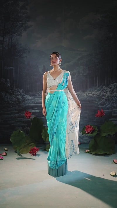 This exquisite ensemble features an aqua blue crepe silk saree with a subtle, all-over printed look, perfectly capturing a serene and fluid aesthetic.
