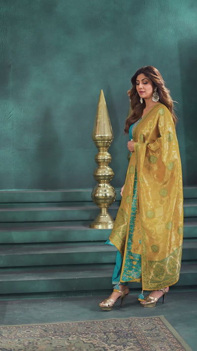Radiate charm and elegance with this ethereal Turquoise Chinon Silk Pant Set, a perfect blend of tradition and sophistication for festive celebrations.