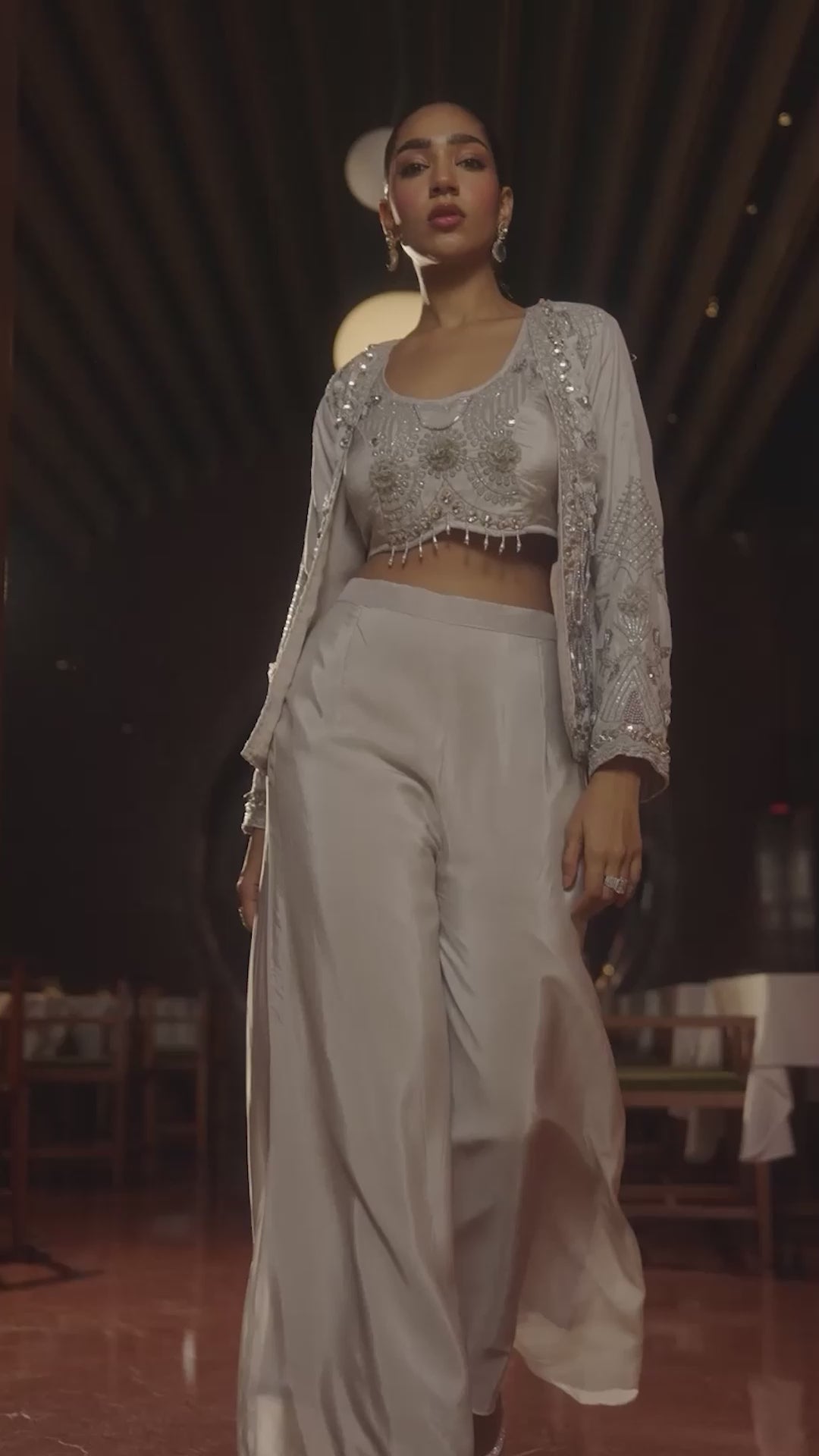 The sheer jacket and coordinating crop top are completely covered in an intricate tapestry of hand-embroidered work, featuring shimmering cut dhana, beads, sparkling sequins, delicate beads, and small stones.