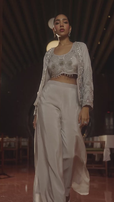 Silver Grey Embellished Crepe Silk Jacket Set