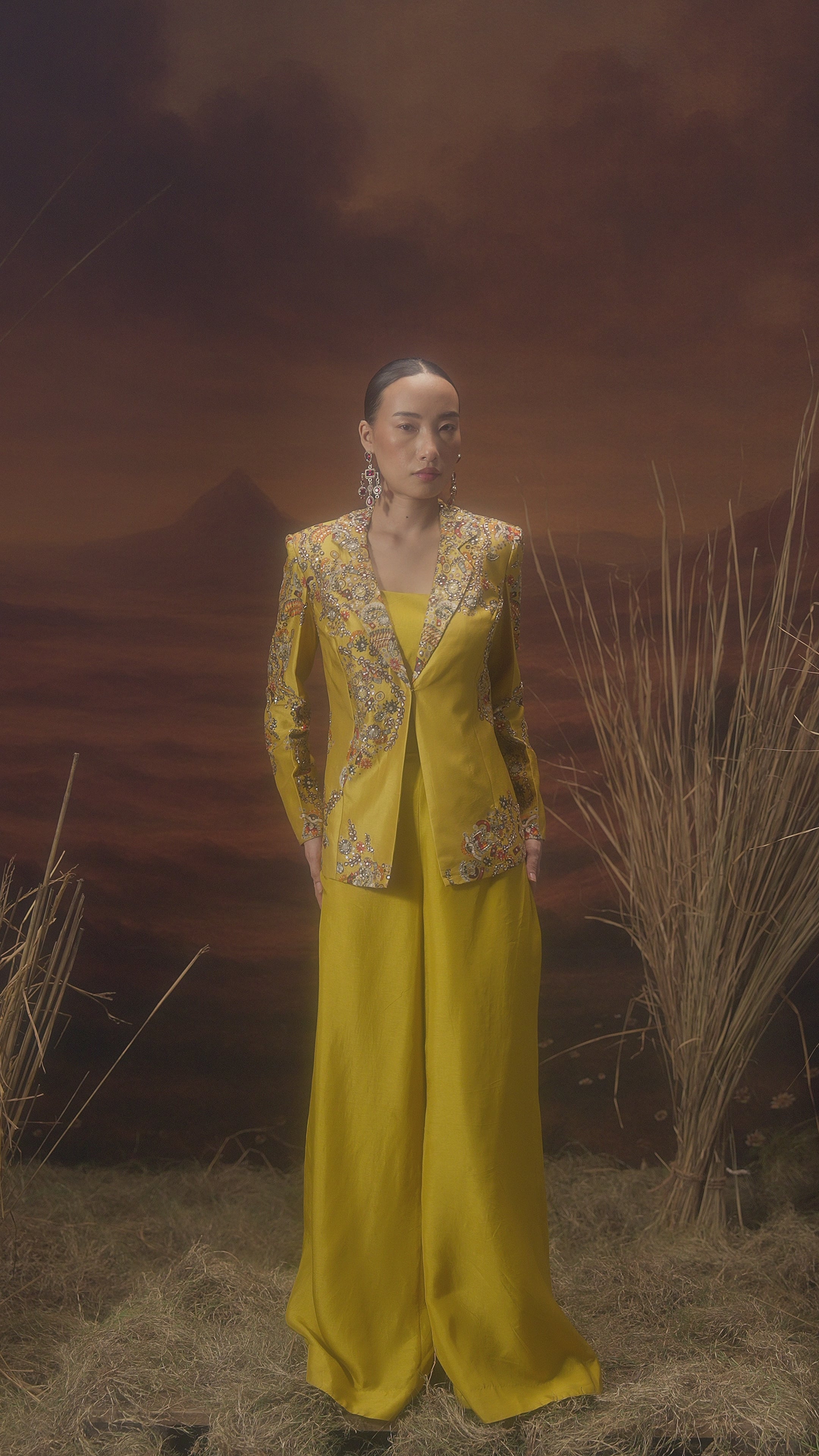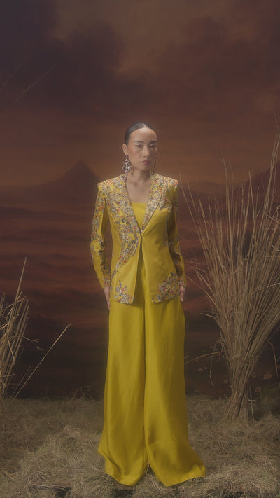 Drenched in a radiant marigold yellow, this Chinon silk co-ord set features a structured embellished jacket paired with wide-leg trousers and a solid crop inner. The jacket is adorned with cut dana, sequins, zari, threadwork, and subtle printed detailing. The blend of modern tailoring and traditional handwork makes it perfect for festive soirées or statement evenings. Bold, bright, and unapologetically elegant.