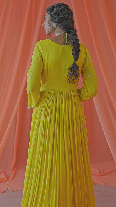 Crafted in luxurious chinon silk, this gown exudes elegance with its radiant mustard yellow hue. The intricate embellishments feature a rich blend of cut dana, beads, sequins, and fine thread embroidery that add texture and sparkle. The asymmetrical hem lends a contemporary twist, while the playful side tassels enhance the silhouette with movement and grace. A perfect pick for festive soirées and celebrations.