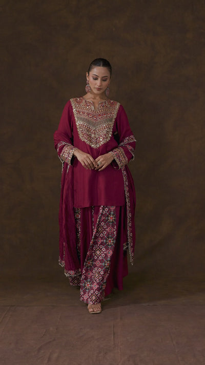 Embrace a festive aura with this magnificent Maroon Set. This three-piece ensemble features a raw silk kurta with a heavily hand-embellished yoke, intricately detailed with multi-colored thread, sequins, and beads. The wide-legged premium silk palazzo and flowing muslin silk dupatta feature a striking Geometric Print, beautifully unifying the traditional and modern elements of the look.