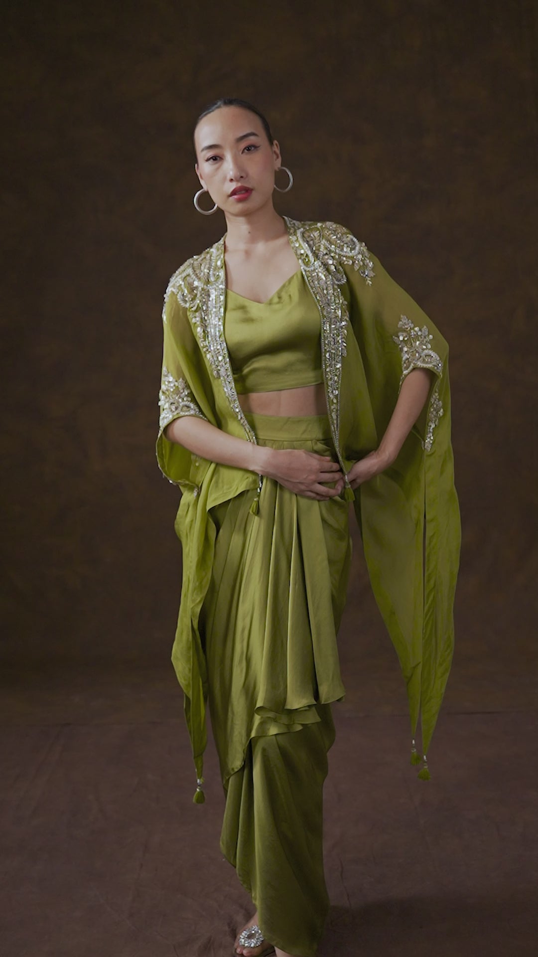 This is an Indo-Western 3-piece set, featuring a structured crop top, a fluidly draped dhoti-style skirt, and a flowing cape.
