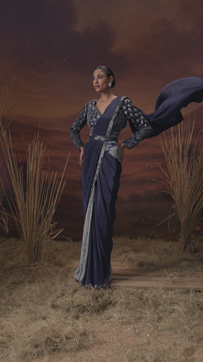 This sophisticated draped saree, made from a luxurious satin silk in a deep purple hue, features a modern and elegant silhouette. It is paired with a padded blouse that is richly embellished with intricate cut dhana, beads, and sequins, adding a beautiful texture and sparkle. The ensemble is cinched at the waist with a complementary embellished belt, which completes this striking and refined look.