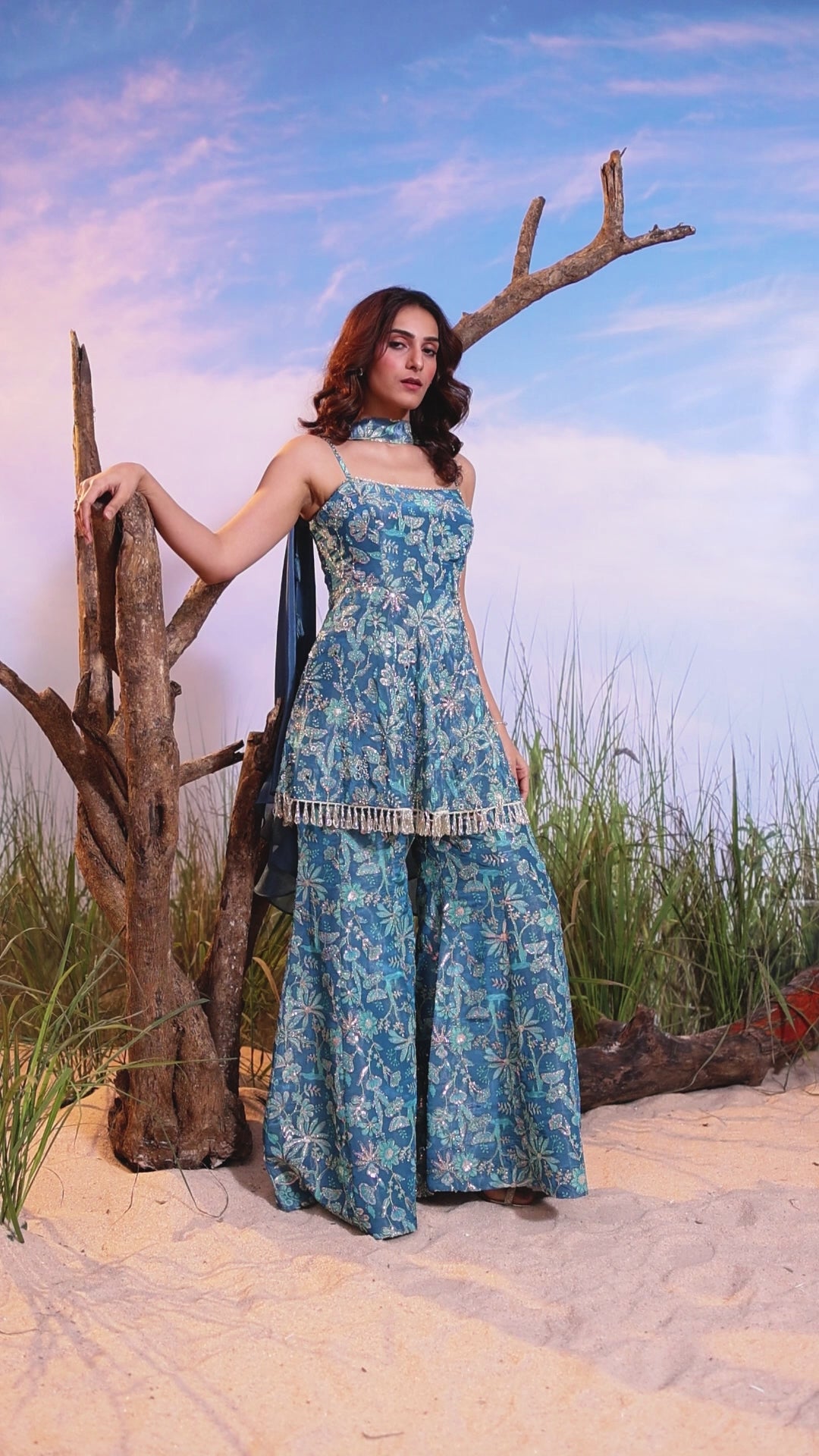 A beautiful Ocean Blue strap kurti with all-over floral print and intricate embroidery, paired with matching flared sharara pants featuring a decorative tassel trim at the knee.