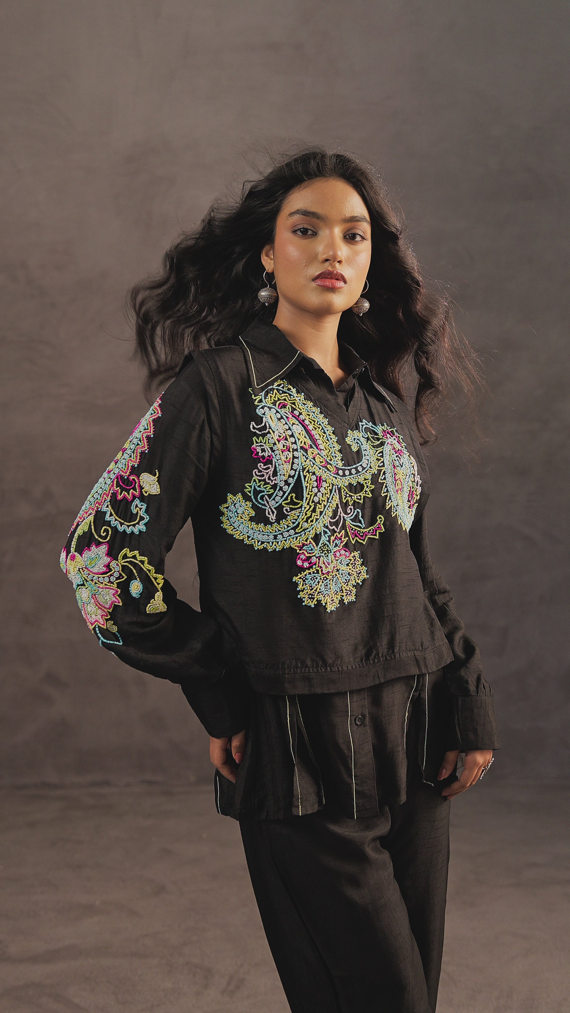Experience versatile elegance with this exquisite Midnight Black Co-Ord Set. This three-piece ensemble, featuring a shirt, a top, and pants, offers multiple styling options. The shirt is beautifully adorned with intricate multi-colored paisley hand-embroidery, while the comfortable pants complete a look that is both stylish and modern.