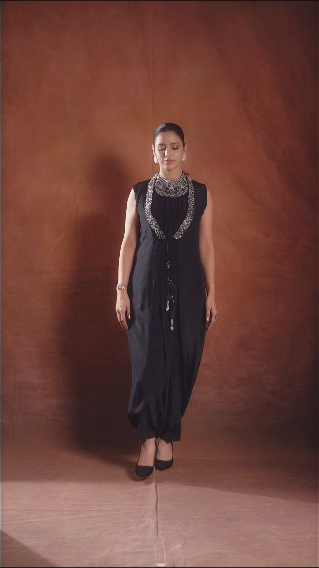 This stunning outfit is a single piece: a Rich Black cowl dress with a modern draped silhouette. The sleeveless dress features a lavishly beaded, sequined, and zari-embroidered high neckline that acts as a statement necklace.
