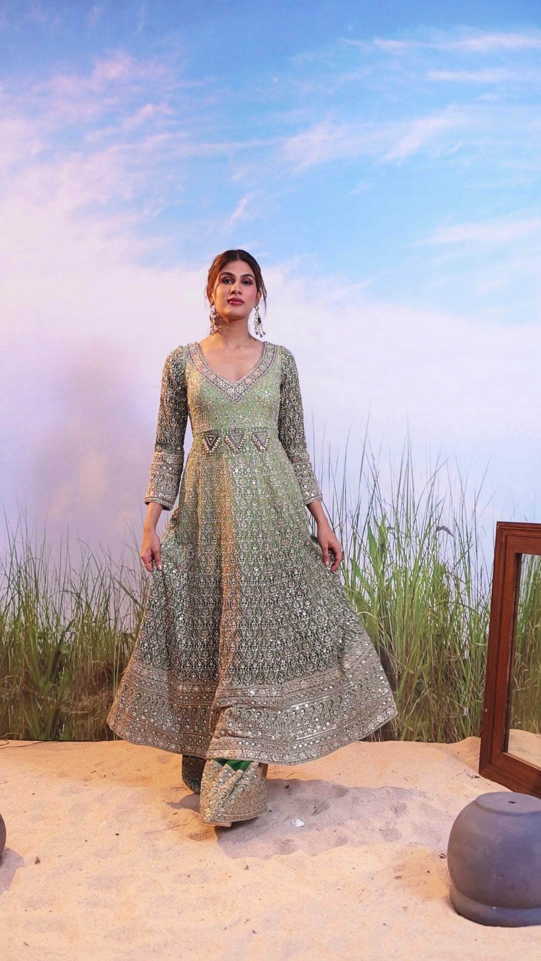 An elegant Mint Georgette Silk Anarkali Set featuring a flared, long-sleeve Anarkali Kurta that is fully embellished with intricate Zardozi, mirror, and sequin work across the bodice and hem, paired with wide-legged matching palazzo pants.