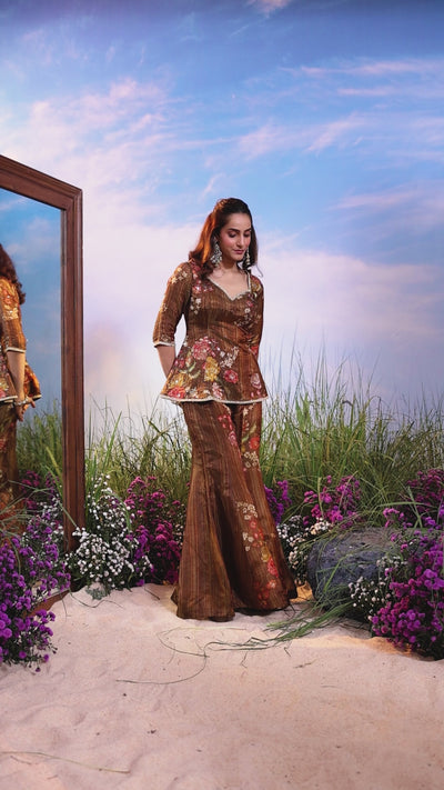 This chic two-piece co-ord set features a unique texture and rich, earthy tones accented by vibrant florals. It includes a fitted Peplum Kurta with an attractive sweetheart neckline, paired with voluminous Flared Palazzo pants, both crafted from shimmering Tissue Silk.