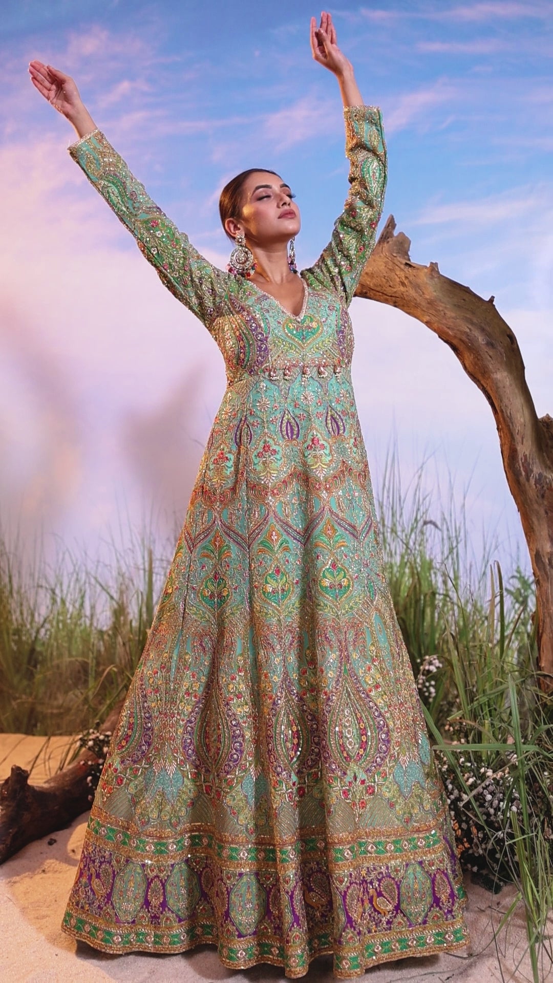 Make a breathtaking statement in this heavily embellished single-piece Anarkali gown. Crafted from flowing Chinon Silk, this full-sleeved garment features a dense, multi-colored hand-embroidery pattern covering the entire length, making it perfect for weddings, receptions, or grand evening events.