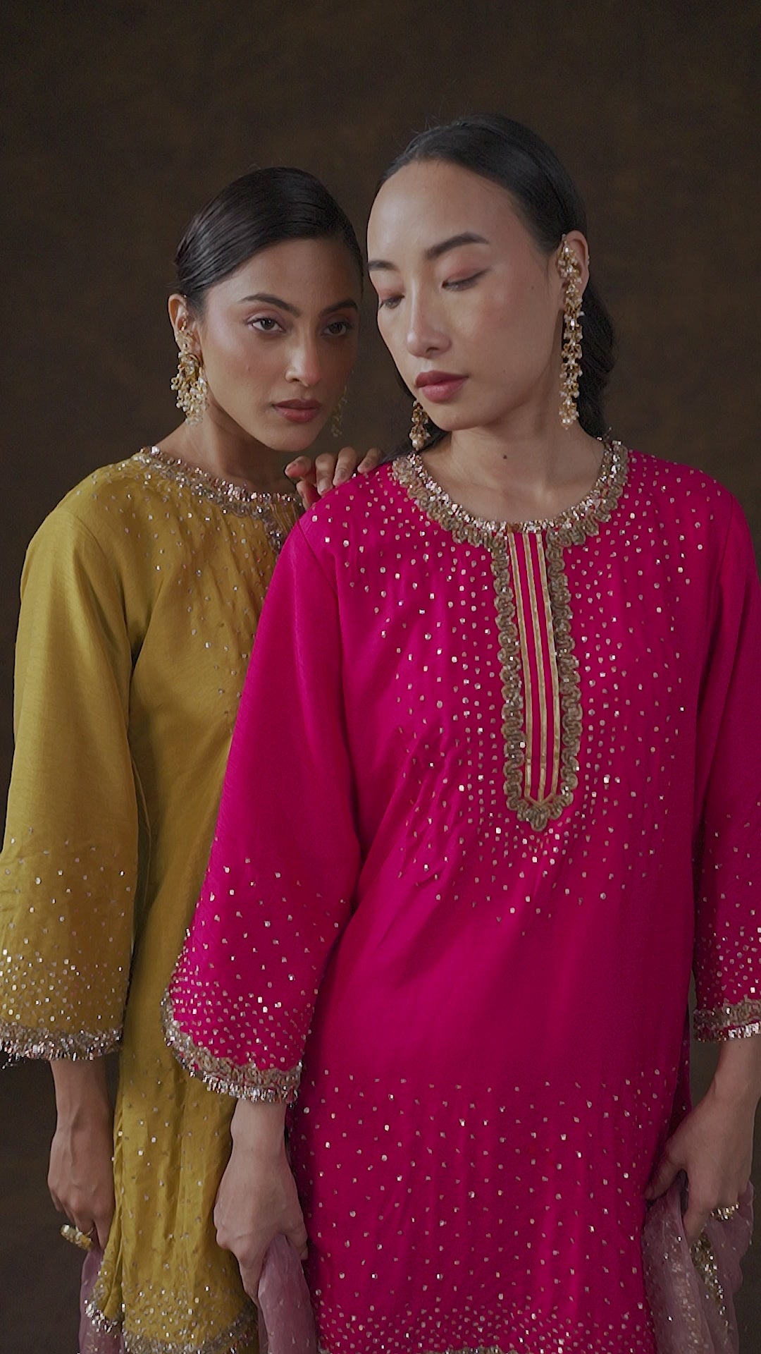 Shine brightly in this stunning Mustard Yellow and Dusty Pink Pant Set. This three-piece ensemble features a short raw silk kurta and pant, both adorned with delicate, all-over sequin work. The set is elegantly contrasted by a sheer organza silk dupatta, which is heavily embellished with sequins and finished with a shimmering Kiran border.