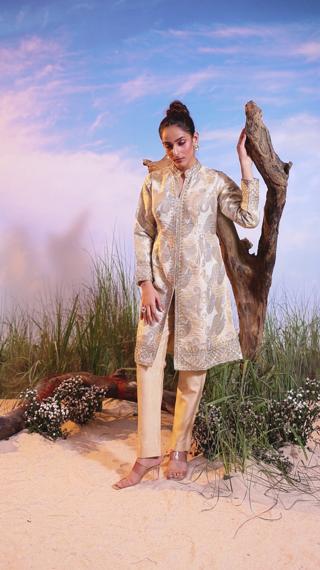 A regal cream and gold brocade silk long jacket/kurta, featuring woven metallic motifs and heavy hand-embroidered borders, paired with matching tailored straight trousers.