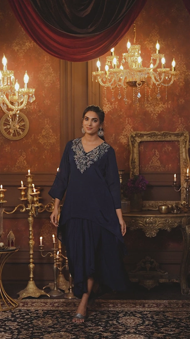 Embrace ethereal grace in this serene Navy Blue Skirt Set. This two-piece ensemble, crafted from flowing Chinon silk, features an asymmetrical high-low kurta with elegant bell sleeves. The V-neckline is exquisitely embellished and is paired with a beautifully draped skirt, creating a layered and contemporary silhouette.