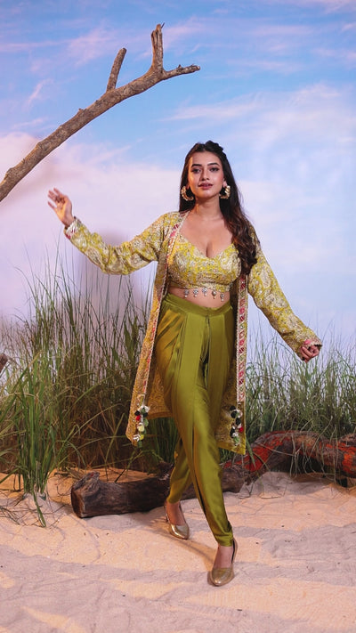 A shimmering Lime Green dhoti pant set featuring a flowing, all-over embroidered long jacket and a matching embellished V-neck crop top. The combination of the structured jacket and liquid-drape pants creates a bold, festive look.