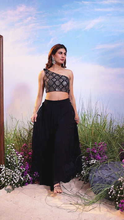 A chic Midnight Georgette Silk Palazzo Set featuring a contemporary one-shoulder crop top heavily embellished with intricate sequin, cut dana, and thread work in a geometric pattern, paired with high-waisted, wide-leg palazzo pants.