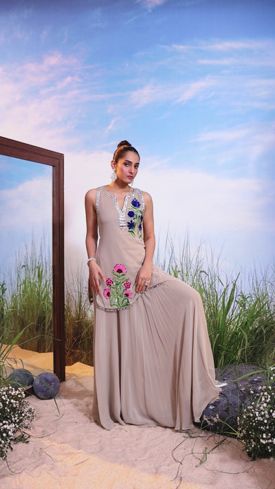 This sophisticated Beige Georgette Silk Kurta and Flared Palazzo Set features a sleek, sleeveless design. The neutral fabric serves as a stunning backdrop for the vibrant floral embroidery, which is intricately embellished with multi-color sequins, cut dana, beads, and stone work at the neckline and hem.