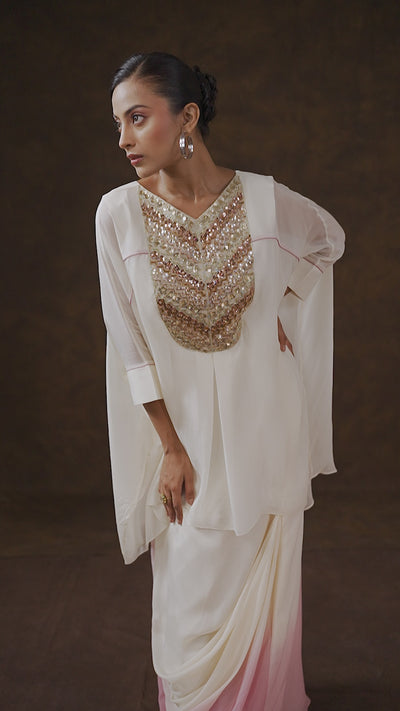 This is a contemporary outfit pairing a loose, flowing Kaftan top with a unique, pre-draped, Ombre Skirt.