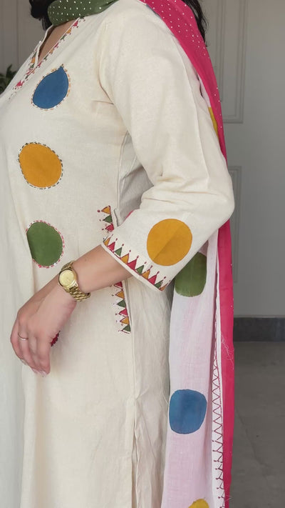 Add a playful twist to your ethnic wardrobe with this off-white cotton suit set featuring vibrant polka dot. The soft V-neck kurta is paired with a matching dupatta adorned in contrasting colors of red, blue, green, and mustard — perfect for casual festive occasions or daytime celebrations. Comes with a matching palazzo. Style it with minimal jewelry and nude heels for a fresh, graceful look.