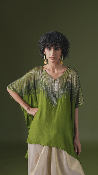Embrace effortless elegance in this striking Olive Green & Golden Beige Set. This three-piece ensemble features a flowing raw silk Kaftan with a hand-embellished yoke, perfectly complemented by a draped skirt crafted from shimmering organza silk. The look is completed with a comfortable inner, making it a sophisticated choice for any occasion.