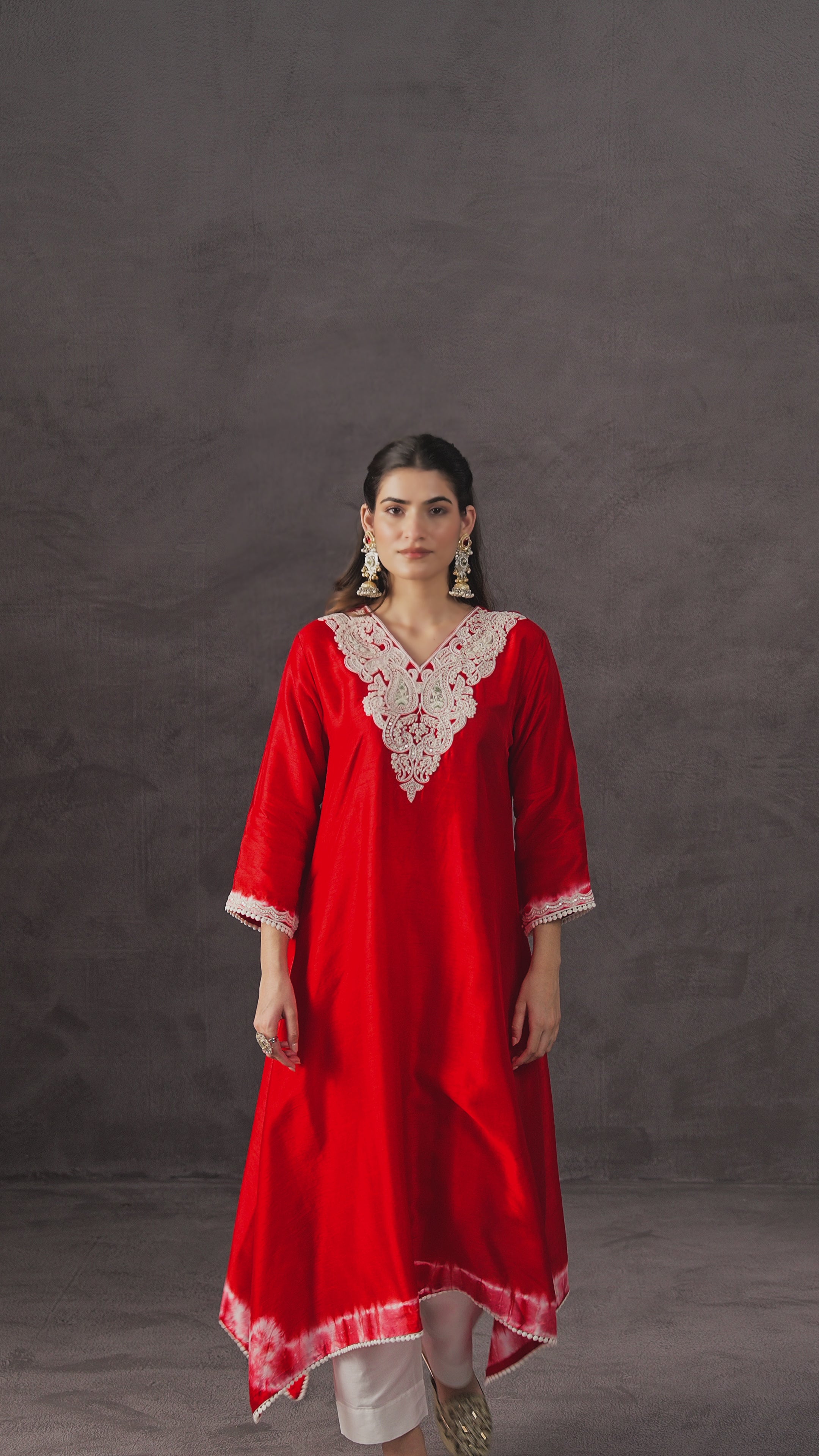 Step into elegance with this red raw silk kurta set, a perfect blend of classic craftsmanship and modern silhouette. Featuring a hand-embellished V-neckline with intricate thread and sequin work, the kurta exudes a graceful charm ideal for festive gatherings. The asymmetrical hemline and subtle tie-dye detailing on the border add a contemporary twist, while the three-quarter sleeves with lace edging enhance its refined appeal. Paired with crisp white straight pants, this ensemble is a go-to for intimate occasions, festive luncheons, or pre-wedding functions. Complete your look with statement earrings and jutties for an effortlessly sophisticated appearance.