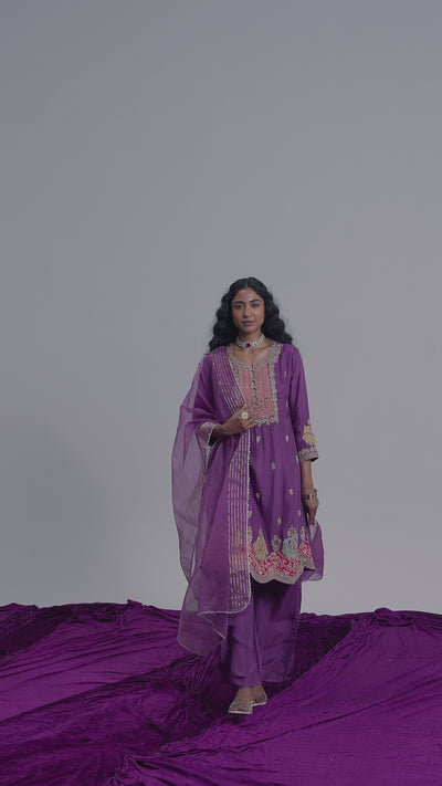 This stunning set features a Chinon silk kurta and pants in a rich orchid purple hue, paired with a flowy organza silk dupatta. The ensemble is intricately adorned with zari, sequins, thread work, beads, and embellished detailing, creating a luxurious festive look. The vibrant embroidery along the hem and neckline adds a regal touch, making it perfect for celebratory occasions.