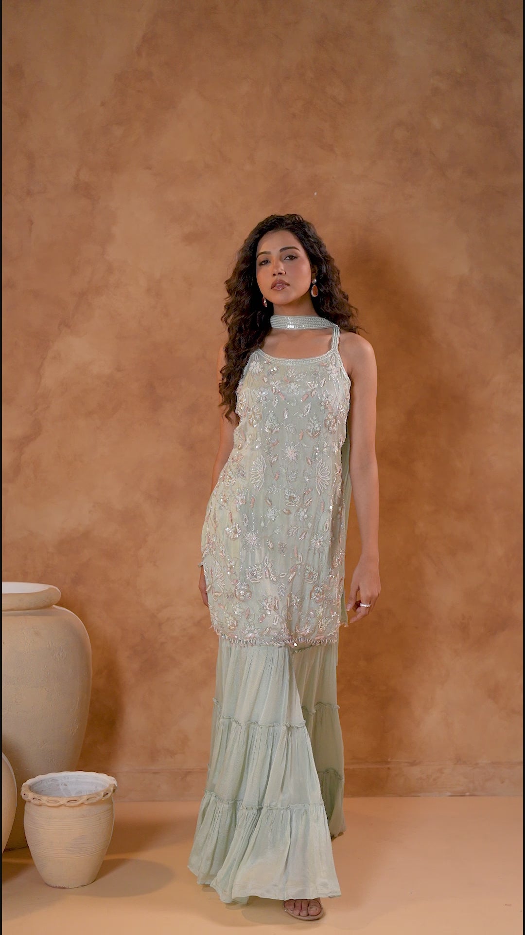 Embrace ethereal beauty in this stunning Pale Mint Green Sharara Set. This three-piece ensemble, crafted from pure chinon silk, features a short kurta and a voluminous, tiered sharara. The kurta is intricately covered in rich hand embellishment, including white cut-dana, sequins, and pearls, with delicate floral thread work. A narrow dupatta, styled as an elegant choker, completes this gracefully flowing look.