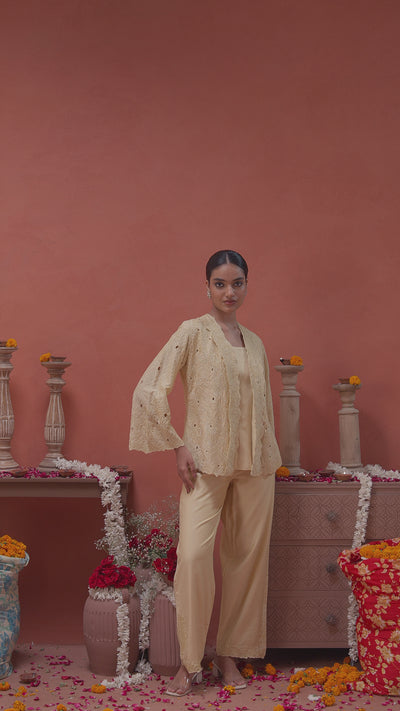 This stunning pale yellow co-ord set is a perfect blend of elegance and comfort. Crafted from luxurious chanderi silk, the ensemble includes a solid crop inner, a pair of trousers, and a stylish jacket. The jacket and trousers are adorned with intricate cut work, beads, and thread embroidery, adding a touch of sophisticated artistry to the lightweight, translucent fabric.