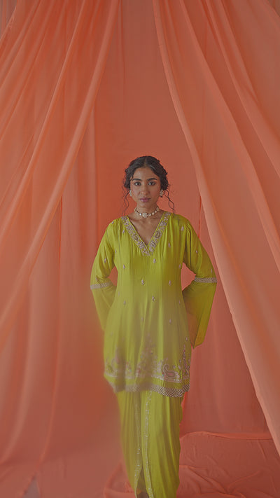 The flared bell sleeves and finely draped dhoti pants bring in a fusion of classic and contemporary styles.