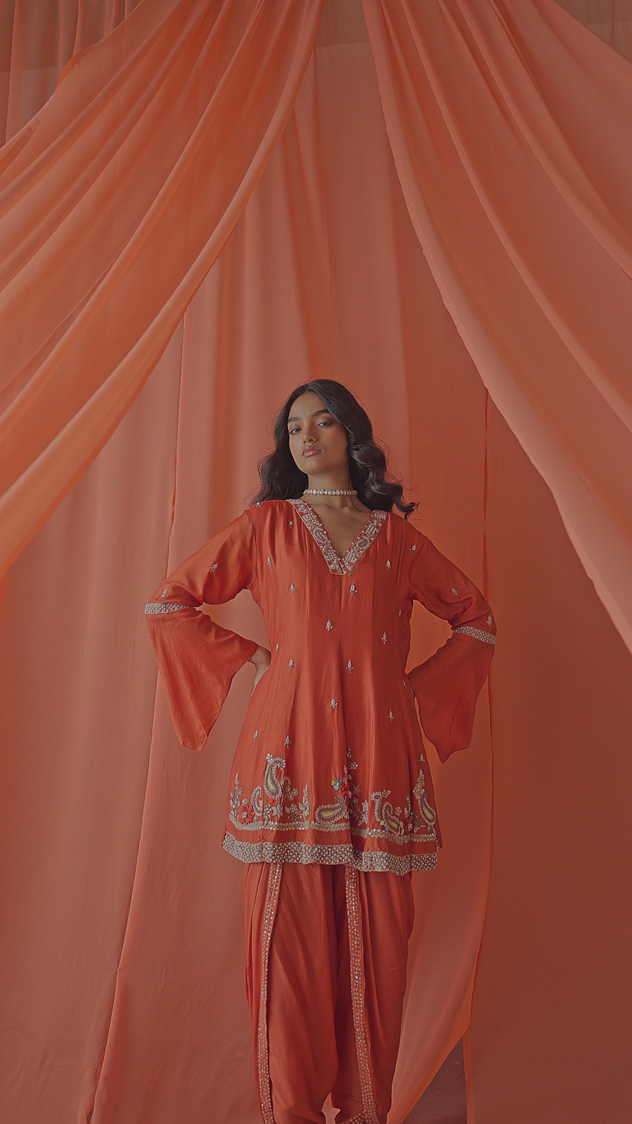 Dusky Orange Embellished Chinon Silk Dhoti Set
