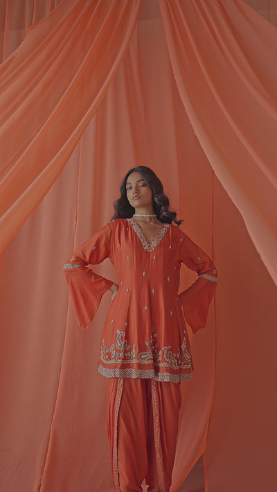 This Chinon silk dhoti set in a captivating dusky orange hue exudes effortless elegance. The ensemble features intricate detailing with beadwork, zari, sequins, and delicate golden and embroidery thread work. The flared sleeves and hand-embellished neckline add a graceful flair. Its traditional silhouette with a modern twist makes it perfect for festive and celebratory occasions. A truly vibrant piece that blends artisanal craftsmanship with refined charm.
