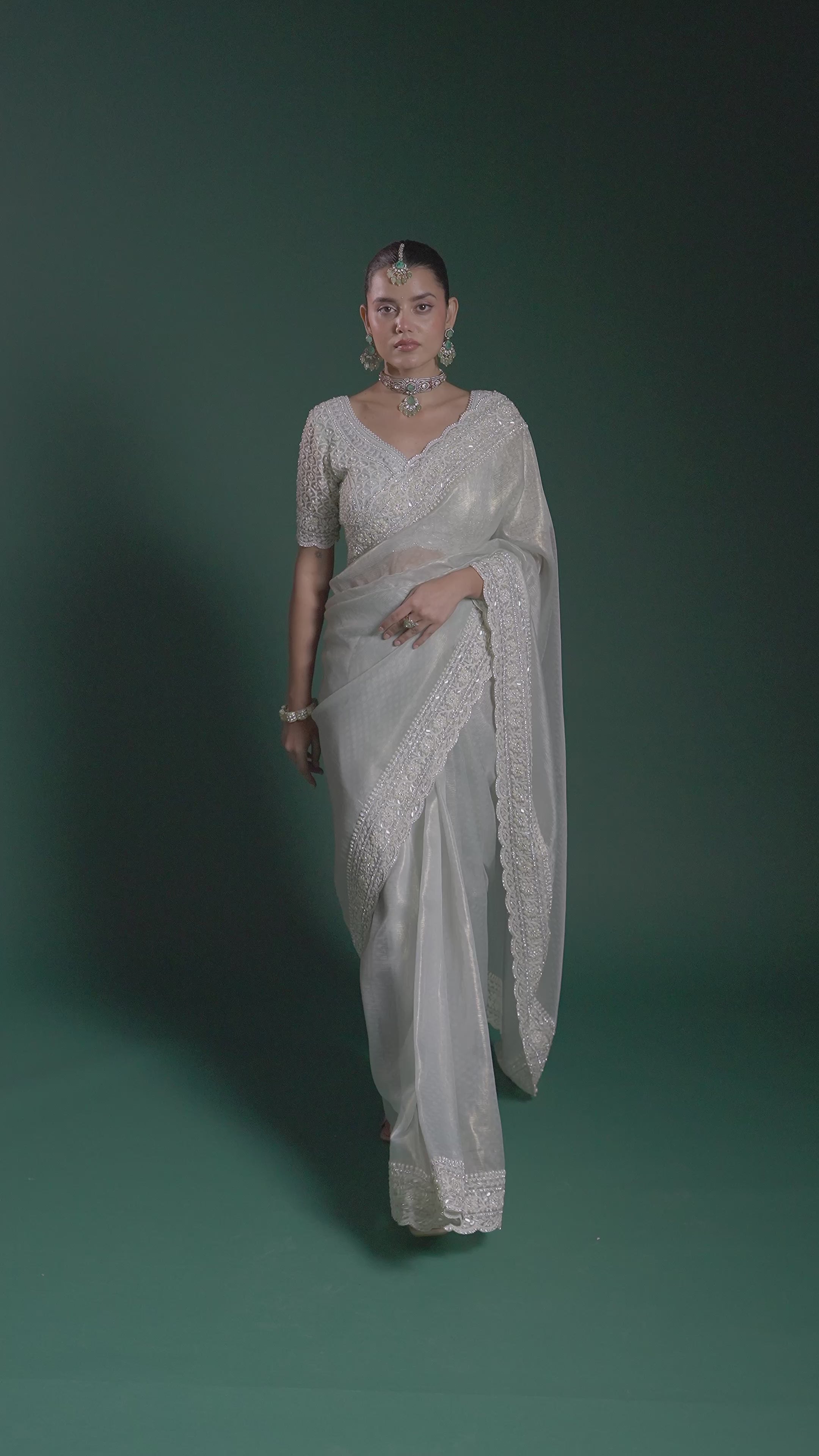 Add a splash of charm with this pastel blue shimmer silk saree, adorned with delicate pearl, stone, and acrylic sequin handwork. The bead and thread lace details bring a playful sparkle, perfectly paired with a ready-made blouse for effortless style. Ideal for celebrations where you want to shine with subtle elegance.