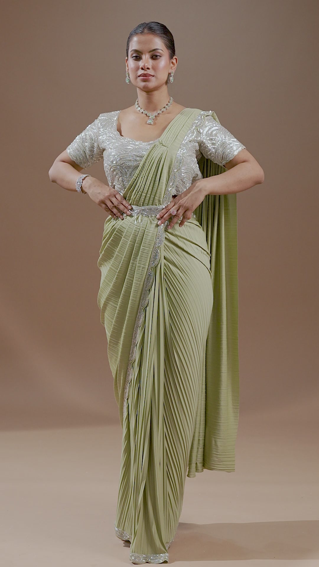 Drape yourself in elegance with our Green Spandex Ready-to-Wear Saree. This stunning piece features pre-pleated fabric, paired with a dazzling cut dana and sequins-embellished blouse. The rich green hues and luxurious spandex fabric exude sophistication, making it an ideal choice for festive occasions. Experience the magic of effortless style with one Ready-to-Wear Saree, a meticulously crafted ready-stitched blouse, and a chic waist belt that completes the look.