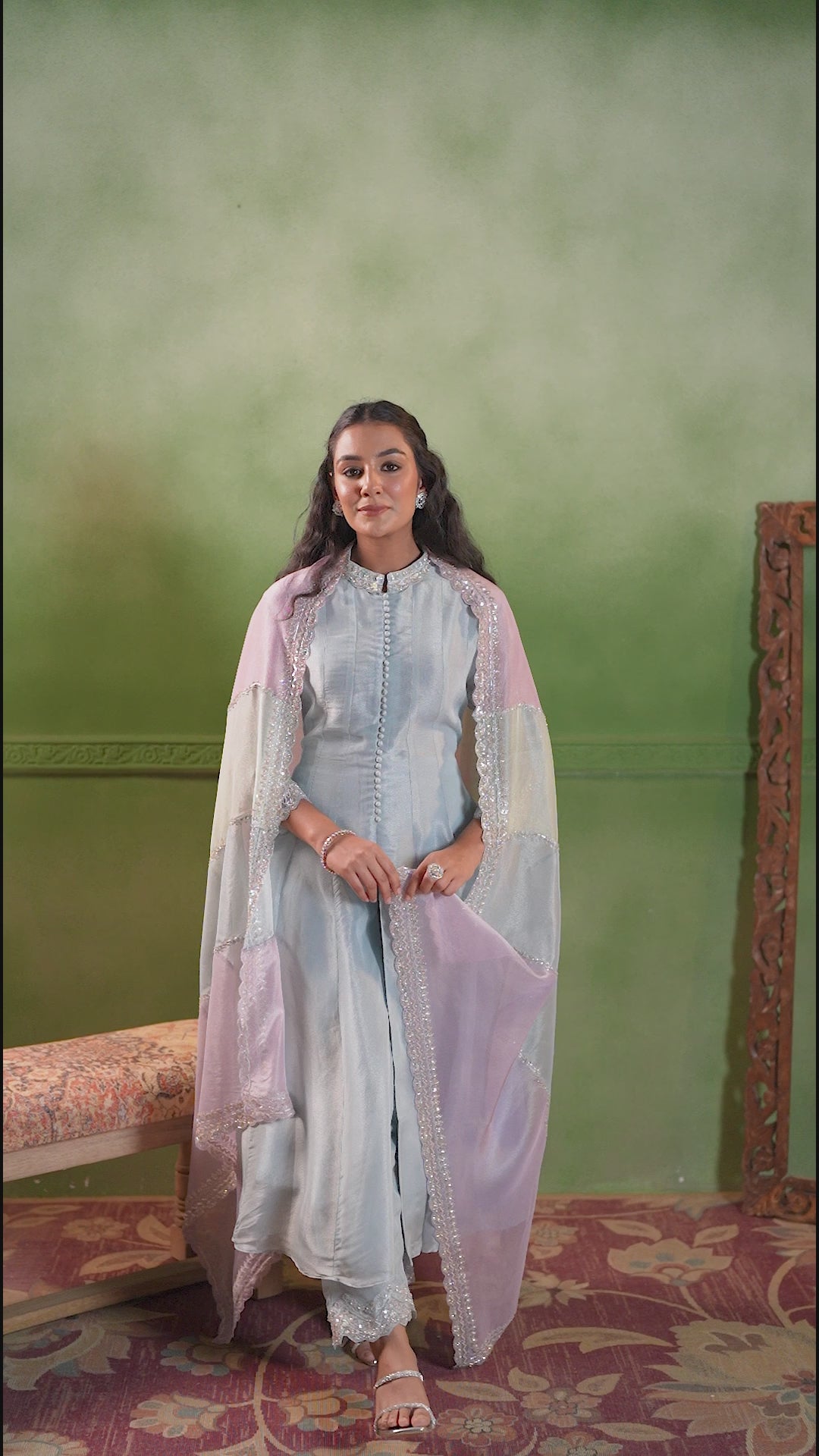 This exquisite set features a shimmery, embellished kurta and pant in soft Pastel Pink. It is stunningly paired with a sheer, pastel color-blocked dupatta that is beautifully and heavily embellished along the borders, creating a cohesive and luminous festive look.
