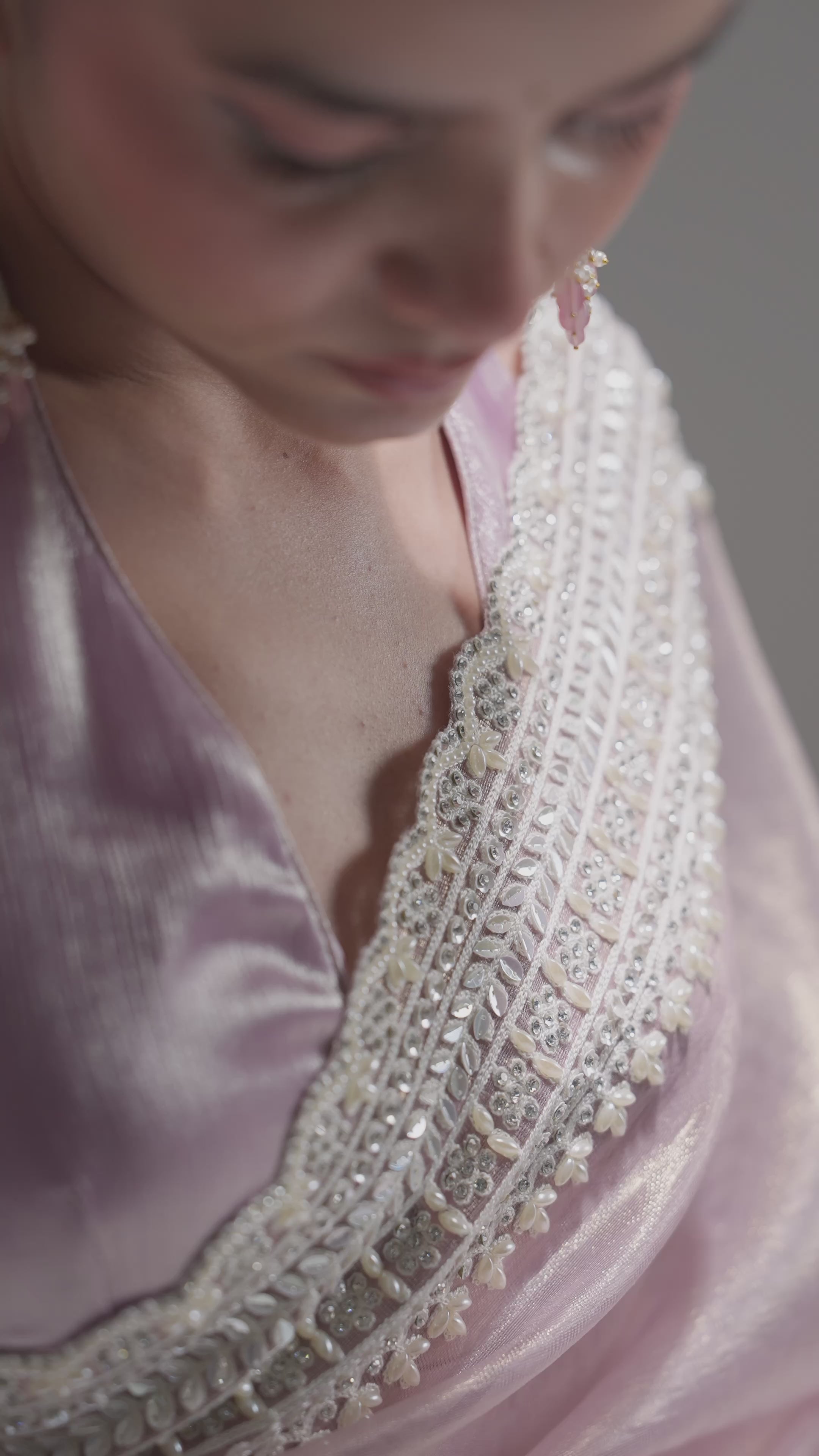 Add a splash of charm with this pastel pink shimmer silk saree, adorned with delicate pearl, stone, and acrylic sequin handwork. The bead and thread lace details bring a playful sparkle, perfectly paired with a ready-made blouse for effortless style. Ideal for celebrations where you want to shine with subtle elegance.