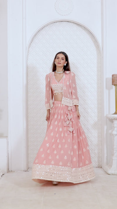 Exuding sovereign grace in our signature Pastel Pink Handwork Georgette Silk Lehenga Set. The cut sleeves blouse is adorned with intricate sequins, beads, cutdana, pearl tassels and white thread embroidered work with stylish cape style jacket. Paired with a matching lehenga which is artfully crowned with a richly embellished border. This ensemble is an ode to regality.