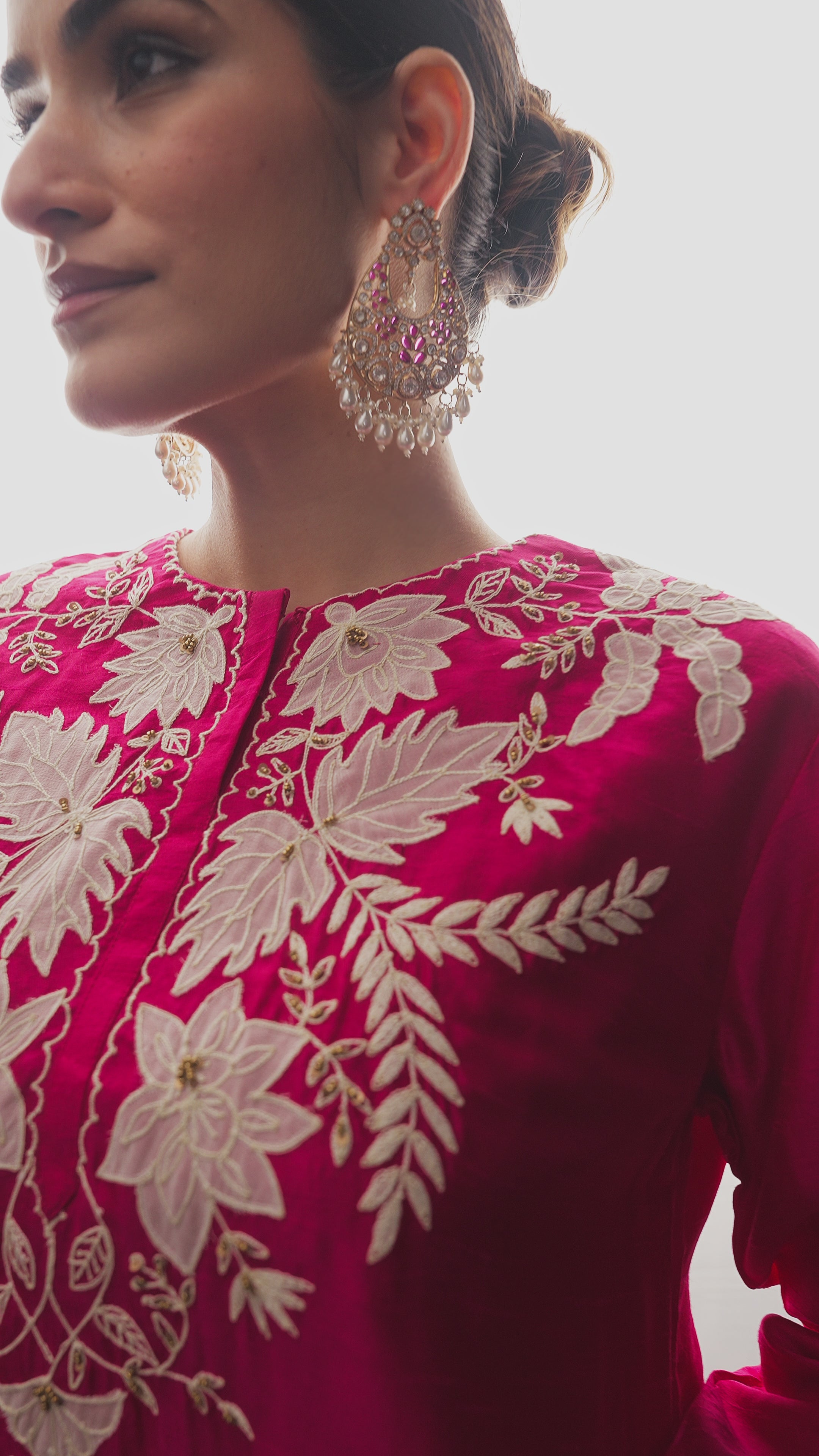 Make a regal statement in this striking Rani Pink Embroidered Co-Ord Set, crafted from premium raw silk for a rich and lustrous finish. The kurta features intricate ivory thread embroidery along the neckline, hem, and sleeves, lending a refined elegance to the ensemble. Delicately hand-embellished with floral motifs, the design balances traditional craftsmanship with modern minimalism. The high-low hemline adds a contemporary flair, while the three-quarter sleeves offer ease and versatility. Paired with straight-fit pants adorned with coordinated embroidery at the cuffs, this set is perfect for formal celebrations, festive gatherings, or elevated eveningwear. The fine scalloped lace detailing along the edges adds a polished finish. Style it with statement earrings and heels for a complete, graceful look. A timeless addition to your ethnic wardrobe, this co-Ord set blends sophistication with cultural charm.