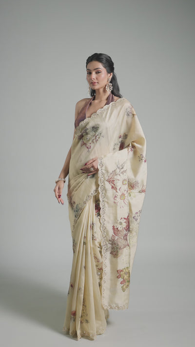 Brighten up your collection with this Pastel Cream Bhagalpuri Tussar Silk Saree. Made from rich tussar silk, it shines with sparkling sequins, detailed aari, and mirror accents that grab attention. The scalloped border adds a playful, charming vibe, ideal for festive occasions. Includes a matching unstitched blouse for you to style your way.