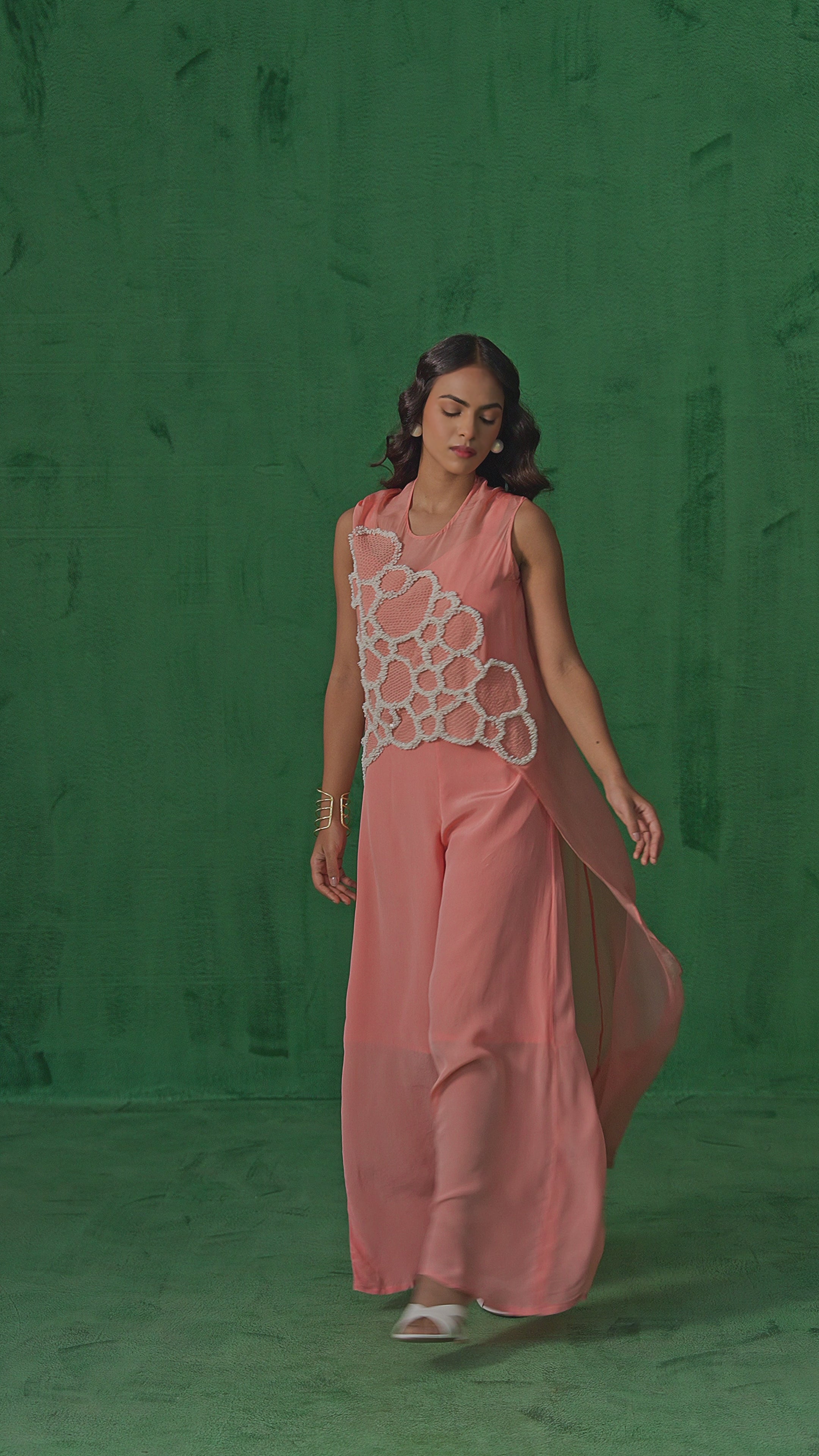 This stylish co-Ord set features a sleeveless organza top with a dramatic side flow, paired with premium crepe palazzo pants for a fluid, graceful silhouette. The top is beautifully detailed with intricate cut dana and bead work in a modern circular motif. The soft peach blush tone enhances its elegance and charm. A perfect fusion of contemporary design and delicate craftsmanship for festive or semi-formal occasions.
